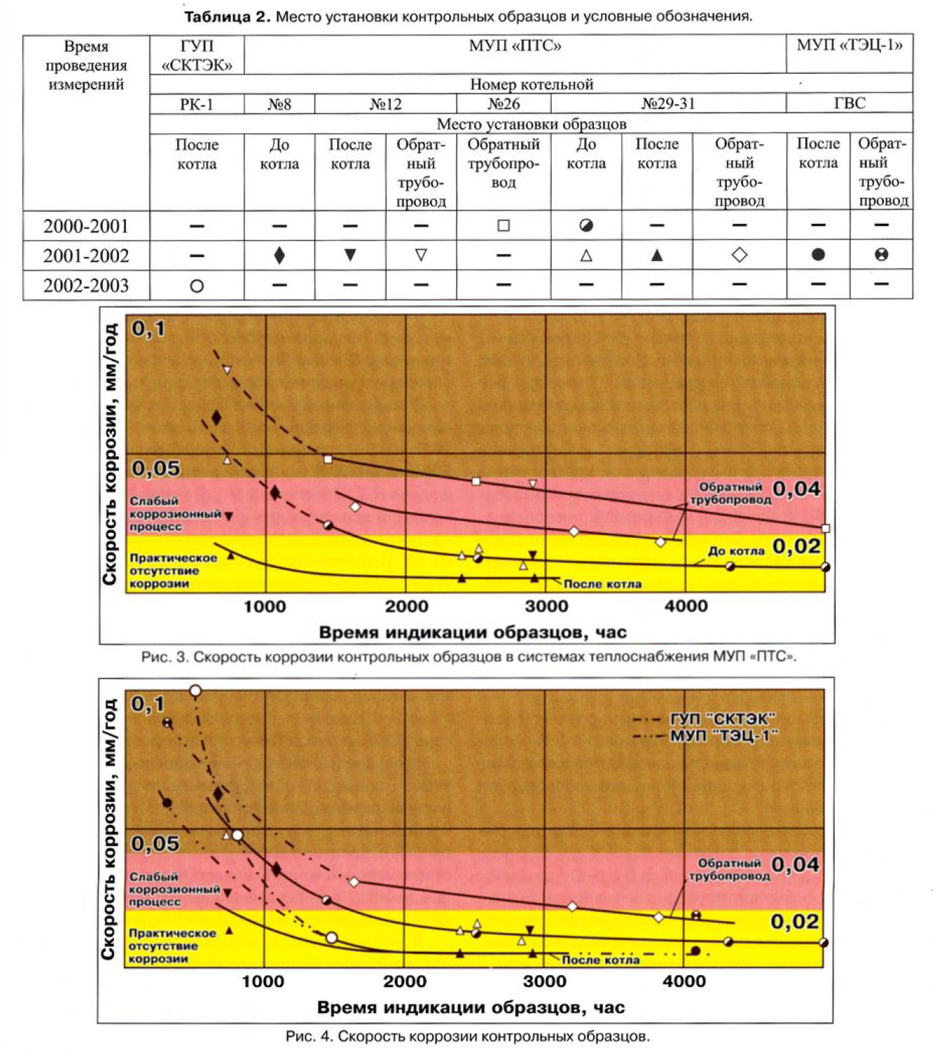 Высокая эффективность Композиции ККФ для стабилизации жесткой воды с карбонатным индексом Ик = 90 (мг-экв/кг)г и более подтверждается опытом промышленного применения с 1995 года, в данной работе при веде ны результаты исследований скорости коррозии на различных участках системы горячего водоснабжения (МУП «ТЭЦ-1») и закрытых систем теплоснабжения с котлами ПТВМ-100 (ГУП «СКТЭК»), а также с котлами НР-18, ТВГ-8 и сетевыми подогревателями (МУП «ПТС»), Системы теплоснабжения работали по температурному графику 115/70 °С (МУП «ПТО) и 130/70 °С (ГУП «СКТЭК»).