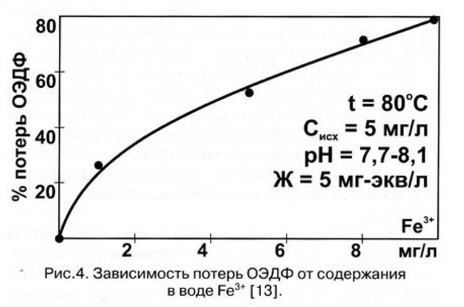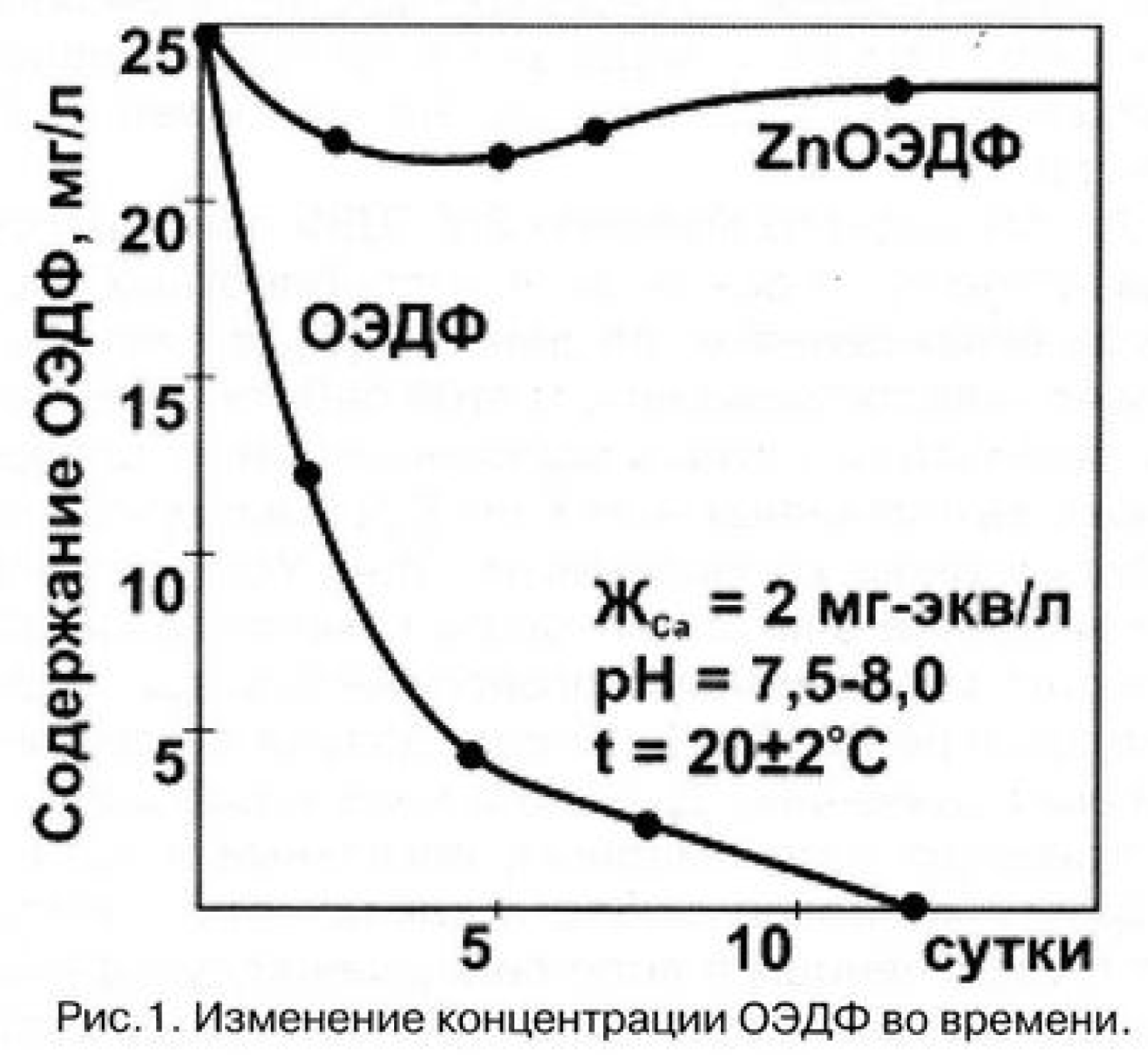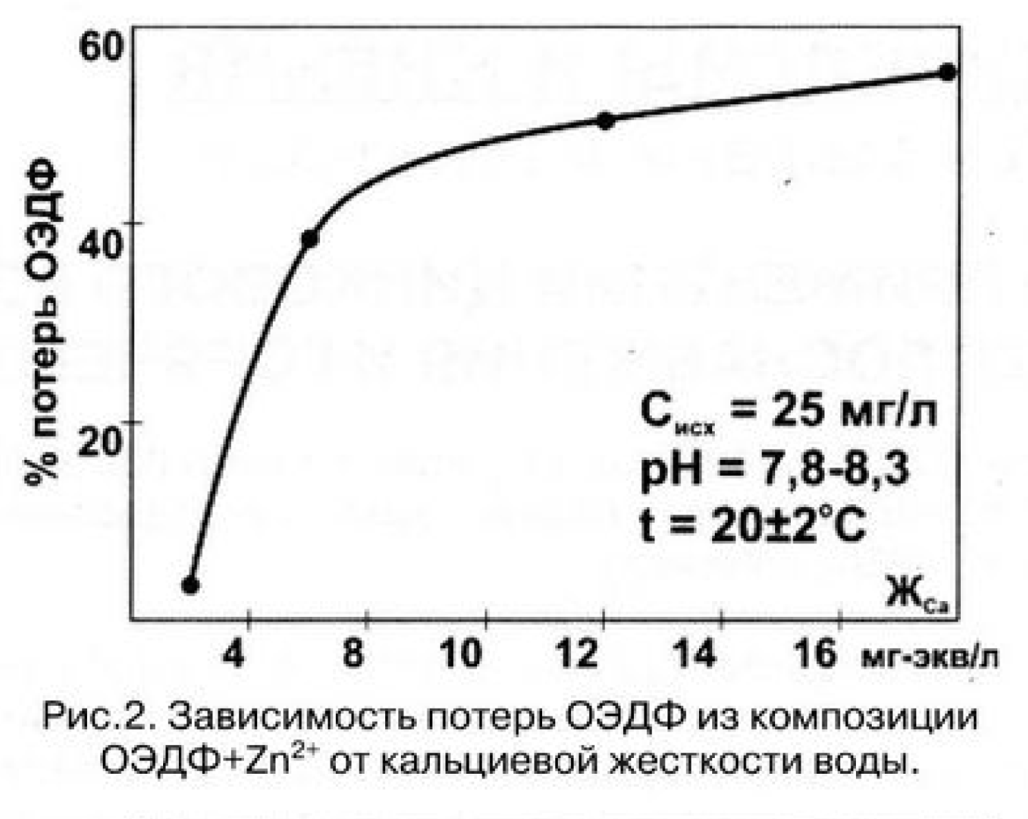 Следует также учесть, что при повышенной температуре (60 °С) образование труднорастворимых соединений происходит значительно быстрее и уже при ЖСа=12 мг-экв/л в тех же условиях потеря ОЭДФ превышает 70% [11].