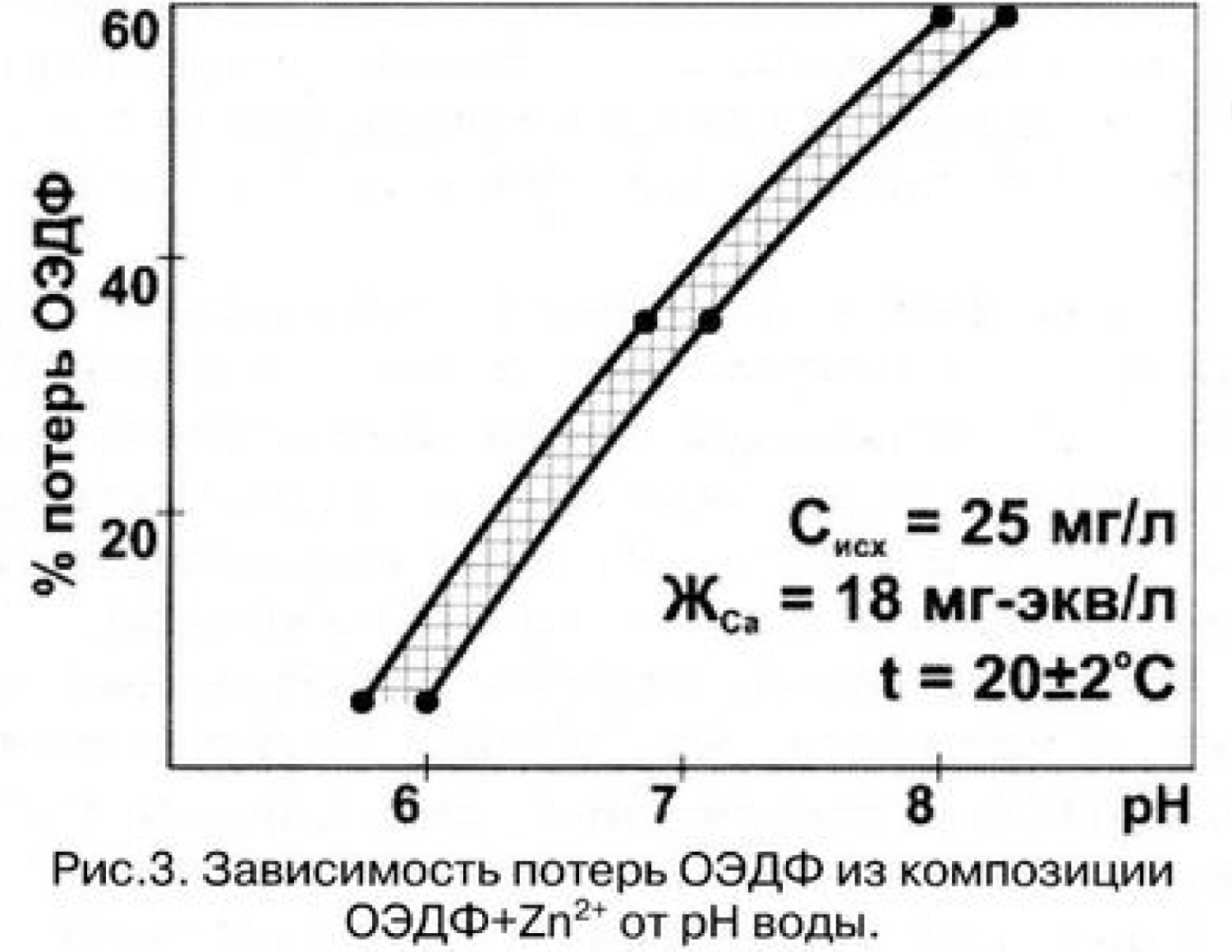 Цинковый комплекс ОЭДФ более устойчив чем комплекс ОЭДФ с Са2+ поэтому потери его в тех же условиях значительно ниже. Однако при увеличении кальциевой жесткости воды стабилизирующее действие цинка на ОЭДФ снижается и при ЖСa=18 мг-экв/л потери ОЭДФ из композиции ОЭДФ+2п2' превышают 50% (рис.2).