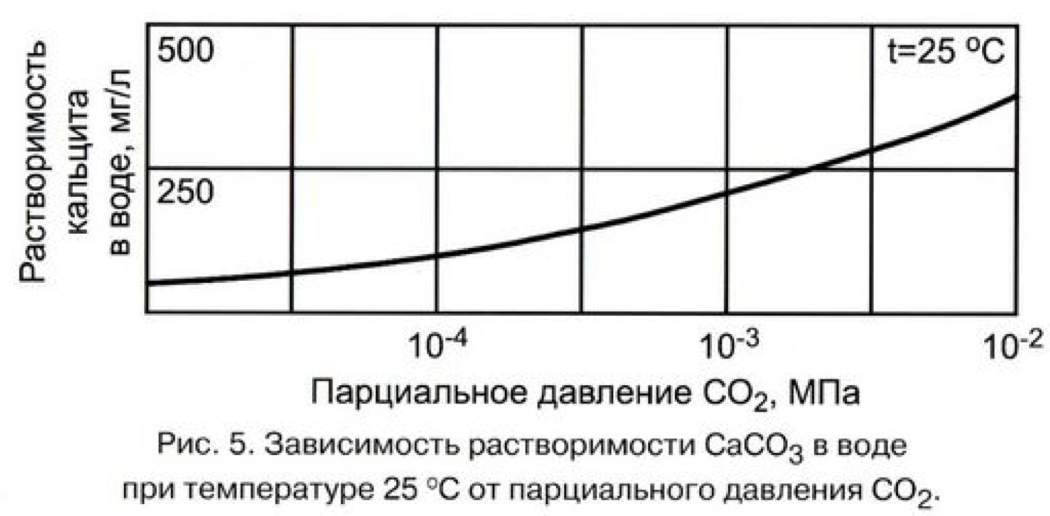 Присутствие в воде растворенного углекислого газа С02 оказывает большое влияние на растворимость карбоната кальция. Растворимость кальцита в воде, находящейся в равновесии с воздухом, составляет около 56 мг/л. Парциальное давление (оно равно произведению общего давления газовой смеси на концентрацию данного газа в молекулярных долях) двуокиси углерода РСо2 в воздухе составляет 3-105 МПа< Если парциальное давление С02 увеличить до 0,01 МПа, то в растворе может содержаться уже около 380 мг/л СаС03(рис> 5).