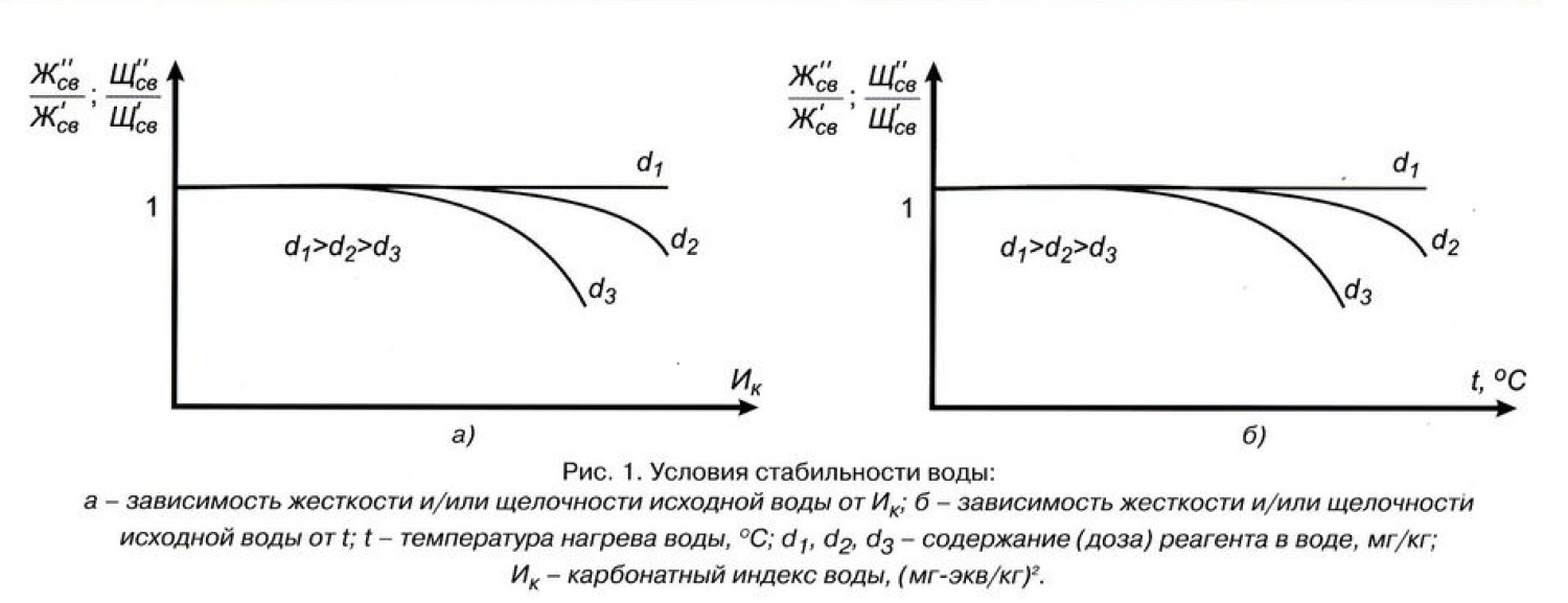 Как видно из рис, 1, доза реагента, необходимая для стабилизации воды, возрастает с увеличением жесткости и/или щелочности исходной воды (а), а также с увеличением температуры нагрева (б). Следовательно, одновременно с увеличением температуры нагрева сетевой воды или накипеобразующих свойств исходной воды необходимо увеличивать концентрацию реагента в сетевой воде.