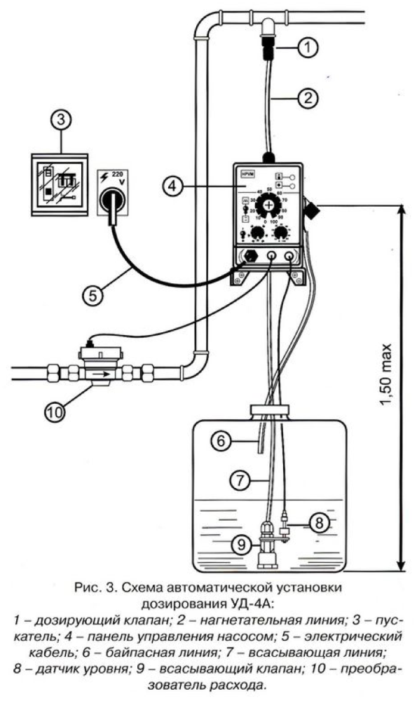 Опыт эксплуатации показал, что УД на основе гидроструйного Н-Д требует постоянного надзора со стороны эксплуатационного персонала и не всегда обеспечивает устойчивый режим дозирования. Поэтому в 2002 г. эта установка была заменена на автоматическую установку дозирования УД-4А на основе электромеханического Н-Д с управлением от импульсного преобразователя расхода (рис. 3). Установка обеспечивает устойчивый режим дозирования реагента пропорционально расходу подпиточной воды, а также имеет возможность корректировать режим дозирования как по температуре нагрева сетевой воды, так и при изменении жесткости и щелочности исходной воды.