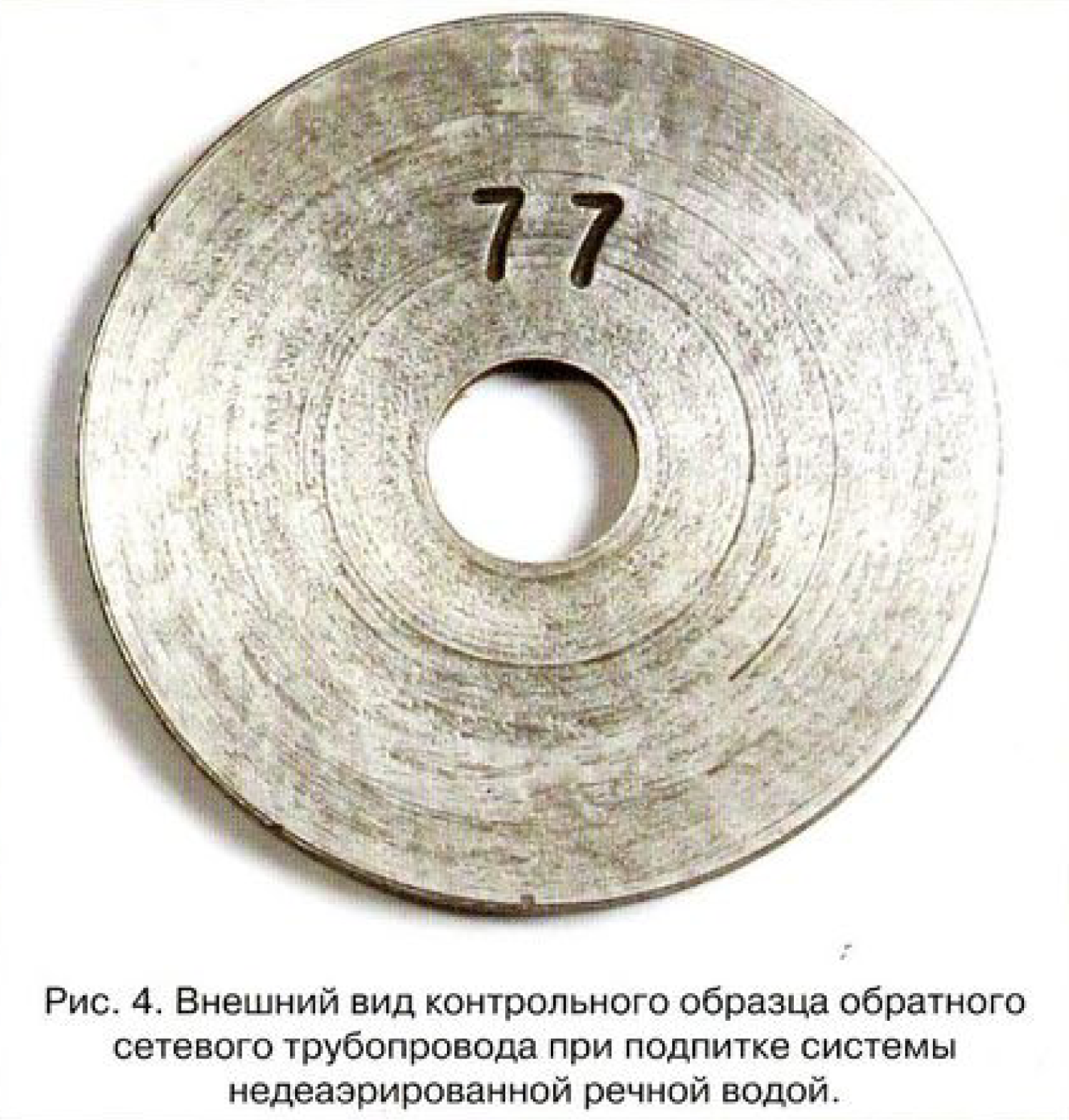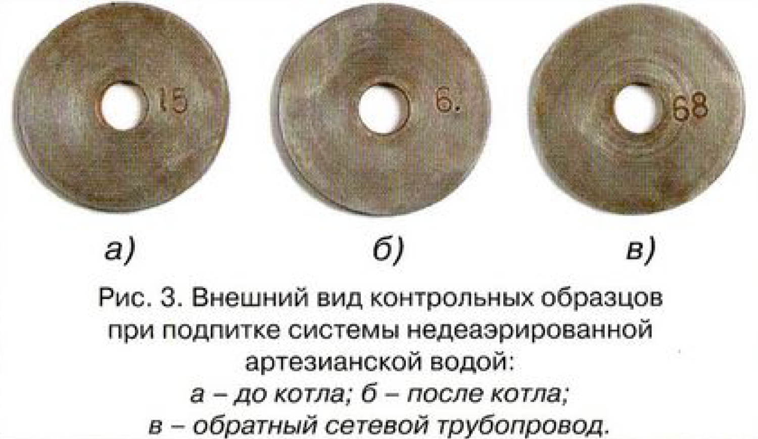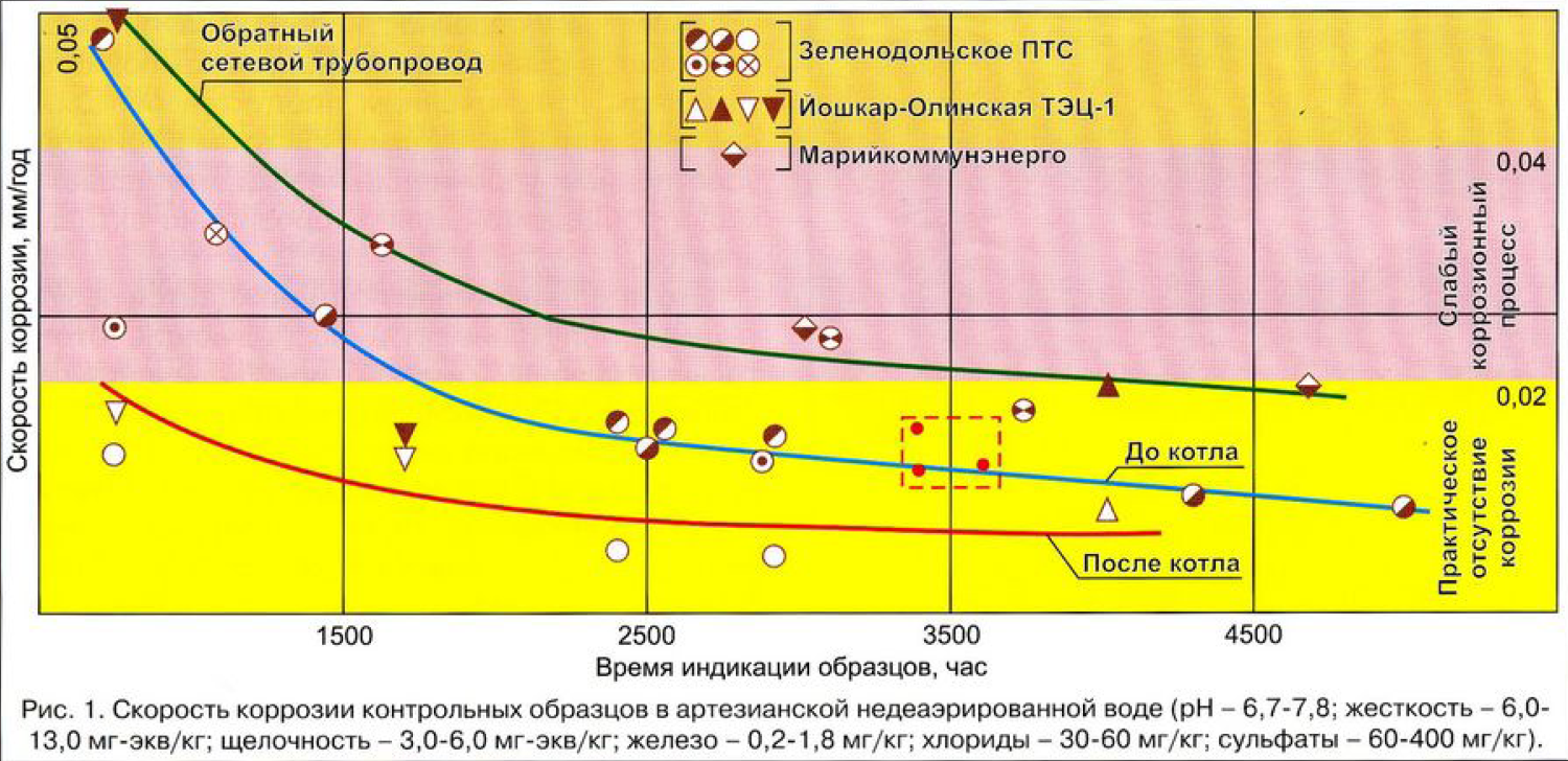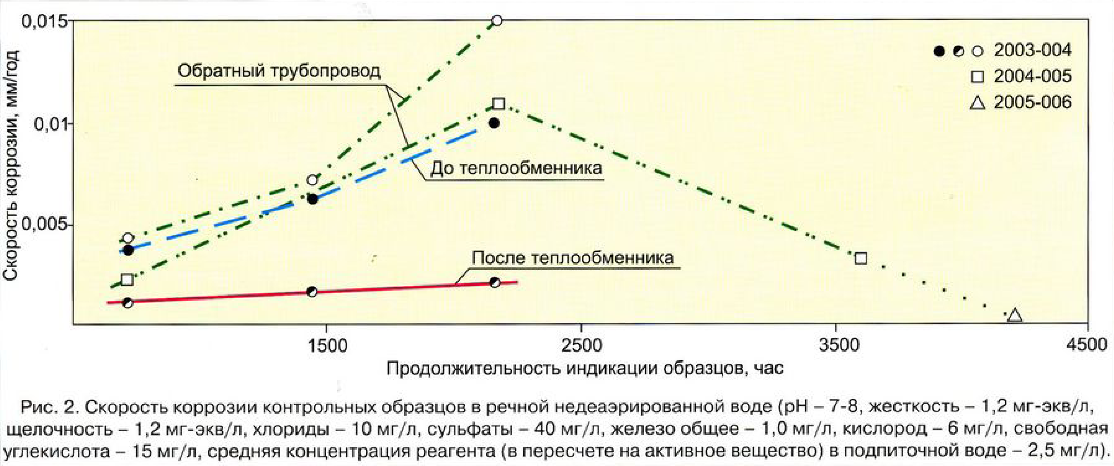 Это предположение подтверждается результатами, полученными в последующие отопительные сезоны, а именно; при увеличении продолжительности экспозиции образцов до 3600 ч кривая изменения скорости коррозии претерпевает излом с последующим резким снижением до 0,003 мм/год. По мере отмывки системы от имеющихся отложений за счет более интенсивного формирования защитной пленки скорость коррозии образцов еще более снижается, и при продолжительности экспозиции 4224 ч составила 0,0001 мм/год.