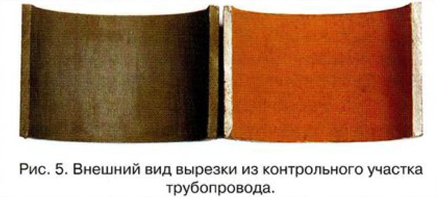 Гравиметрический метод считается одним из наиболее достоверных по получаемой информации, однако коррозия контрольных образцов протекает на поверхности, предварительно очищенной до чистого металла, а коррозия трубопроводов - при наличии на поверхности оксидных пленок и сформировавшихся отложений. В эксплуатационных условиях трубопровод подвергается совместному воздействию коррозионной среды и механических напряжений, разрушающих защитные оксидные пленки, По месту разрушений начинает протекать локальная коррозия. Для контроля фактического состояния трубопроводов в них вваривались контрольные участки из новой трубы. На рис, 5 показана вырезка из контрольного участка трубопровода (условия рис. 1). Внутренняя поверхность трубопровода покрыта сплошной равномерной защитной пленкой. Под слоем пленки на поверхности металла, как и в случае контрольных образце в, отсутствуют следы локальной коррозии.