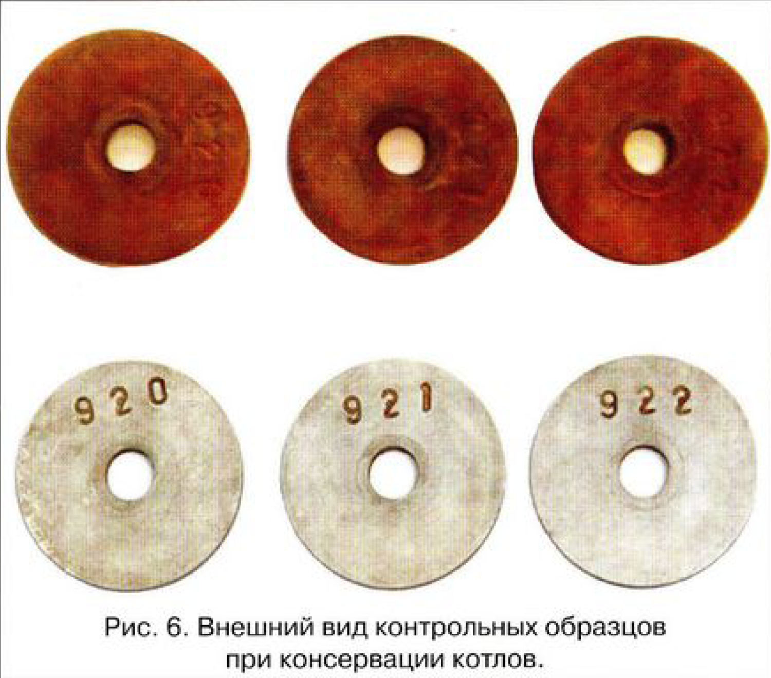 До консервации в барабанах котлов ДКВР-10 имелись преимущественно бугристые отложения продуктов коррозии, а в трубах конвективного пучка смешанные отложения. По окончании консервации внутренние поверхности котла были полностью очищены от отложений, в том числе от продуктов коррозии, покрывающих полость язвенных углублений, а поверхность металла покрыта равномерной ровной пленкой черного цвета.