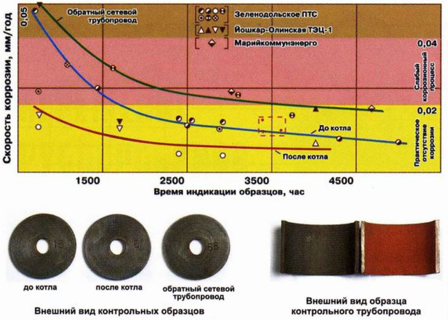 Известно, что характер коррозии в системе теплоснабжения изменяется не только в течение отопительного сезона (т. е. во времени), но и по мере удаления от источника тепла. Поэтому коррозионные процессы контролировались в трех точках системы: до котла, после котла и в обратном сетевом трубопроводе до врезки подпиточного трубопровода.