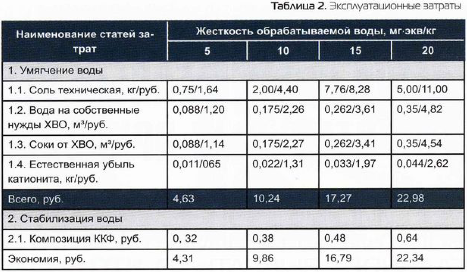 1. Успешно применяемый с 1994 г. в ряде регионов России реагент - композиция ККФ - представляет собой перспективную экономически эффективную (см, табл. 2) и экологически безопасную альтернативу тра-диционным водно-химическим режимам, применяемым в теплоэнергетике. Преимуществом данного ингибитора является его универсальность как для стабилизации жесткой, недеаэрированной подпиточной и сетевой воды, так и для консервации всех элементов оборудования тепловой схемы котельной, включая котел, вспомогательное
