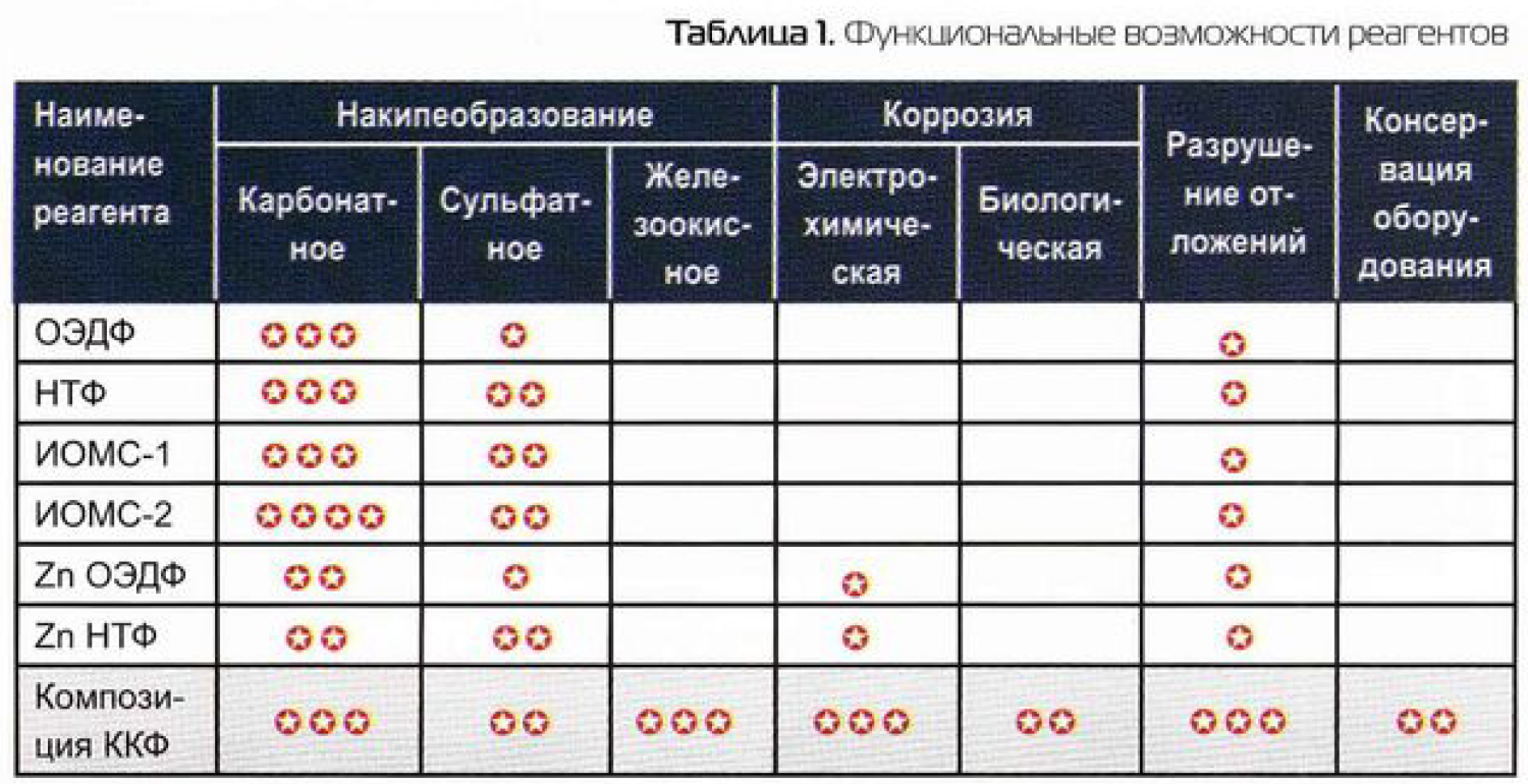 При принятии решения о практическом применении того или иного ингибитора следует иметь в виду, что в настоящее время универсального реагента, позволяющего решить проблемы накипеобразования и (или) коррозии в любых условиях, не существует. Область эффективного применения фосфонатов в значительной степени ограничена действием целого ряда разнона правленных факторов. В табл. 1 приведены функциональные возможности некоторых отечественных реагентов, наиболее широко применяемых в системах теплоснабжения, а также недавно разработанного ингибитора ИОМС-2.