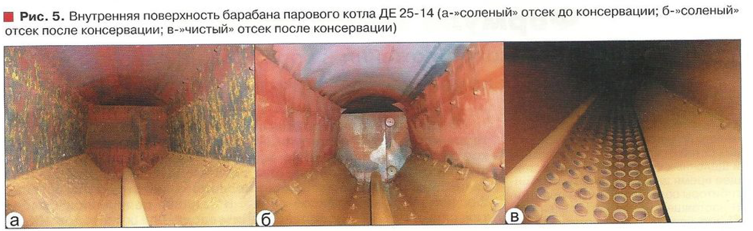 На рис. 5 показано состояние внутренней поверхности парового котла ДЕ 25-14 пуско-резервной котельной Татарской АЗС до и после консервации. До консервации в барабанах котлов имелись преимущественно бугристые отложения продуктов коррозии, а в трубах конвективного пучка смешанные отложения. По окончании консервации внутренние поверхности котла были полностью очищены от отложений, в т,ч, от продуктов коррозии, покрывающих полость язвенных углублений, а поверхность металла покрыта равномерной защитной пленкой.