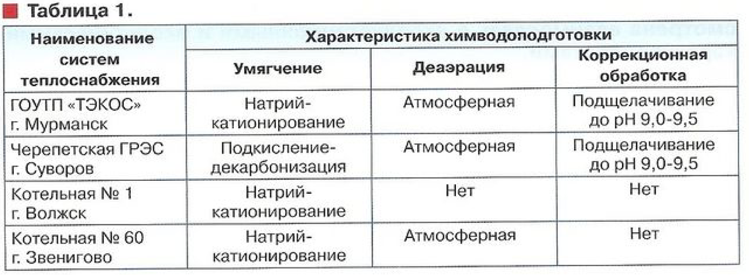 В таблице 1 приведены характеристики различных открытых систем теплоснабжения, реновацию которых проводили специалисты Центра и которых объединяло одно; чрезвычайно низкое качество сетевой воды, вплоть до запрещения ее использования на нужды горячего водоснабжения.