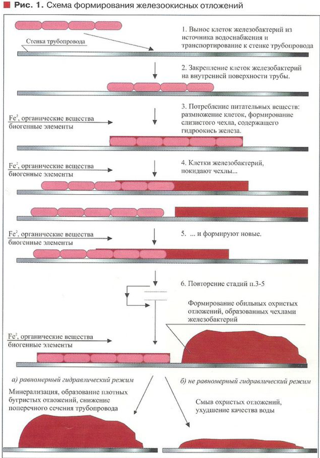Используя разнообразные механизмы окисления закисного железа1 железобактерии выделяют гидроокись железа, которая откладывается на поверхности клеток. При этом образуется типичный биополимерный слизистый чехол, который препятствует сообщению клеток с внешней средой. Когда чехол становится достаточно плотным, клетки покидают его. Покинув старый чехол, они приступают к выработке нового. Даже при незначительном количестве (менее 0,3 мг/л) железа в воде (прежде всего, двухвалентного) клетки микроорганизмов активно аккумулируют его, так как испытывают в нем физиологическую потребность. Таким образом, на поверхности трубопровода появляются участки, покрытые обильными охристыми отложениями, образованными биогенным путем.